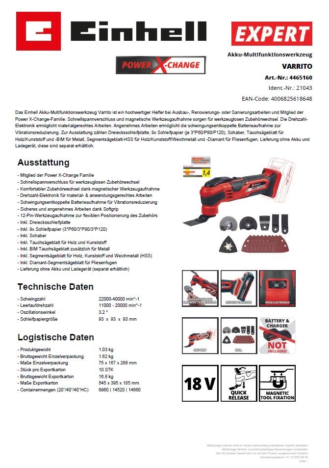 Sägen, Schleifen, Schaben - alles aus einer Hand - der hochwertige Helfer bei Ausbau-, Renovierungs- oder Sanierungsarbeiten - Art.Nr.: 4465160Artikel-Nr.: 85100022 Hersteller: Einhell Germany AG