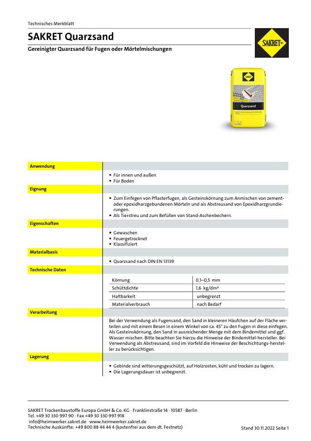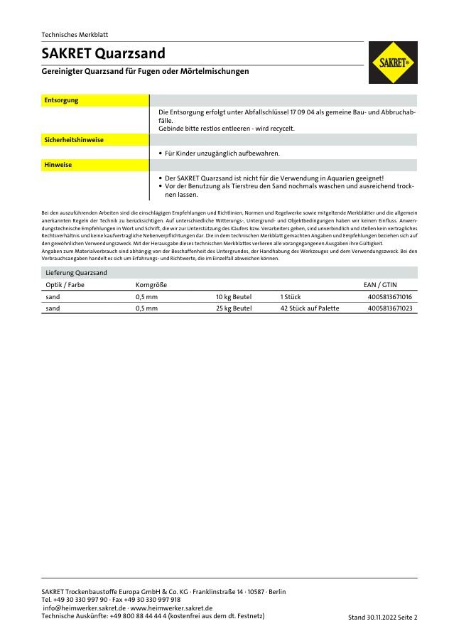 Gereinigter Quarzsand für Fugen oder Mörtelmischungen Artikel-Nr.: 88611600 Hersteller: SAKRET Trockenbaustoffe Europa GmbH & Co. KG Grundpreis: € 0,89/kg