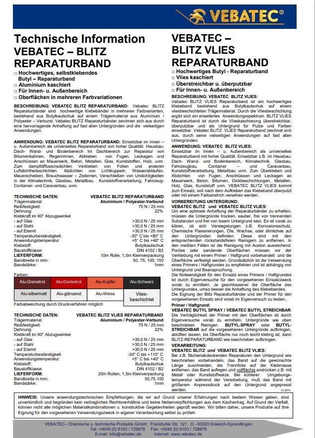 Vebatec Blitz Vlies Reparaturband ist ein hochwertiges Klebeband bestehend aus Butylkautschuk auf einem vliesbeschichteten Trägermaterial.