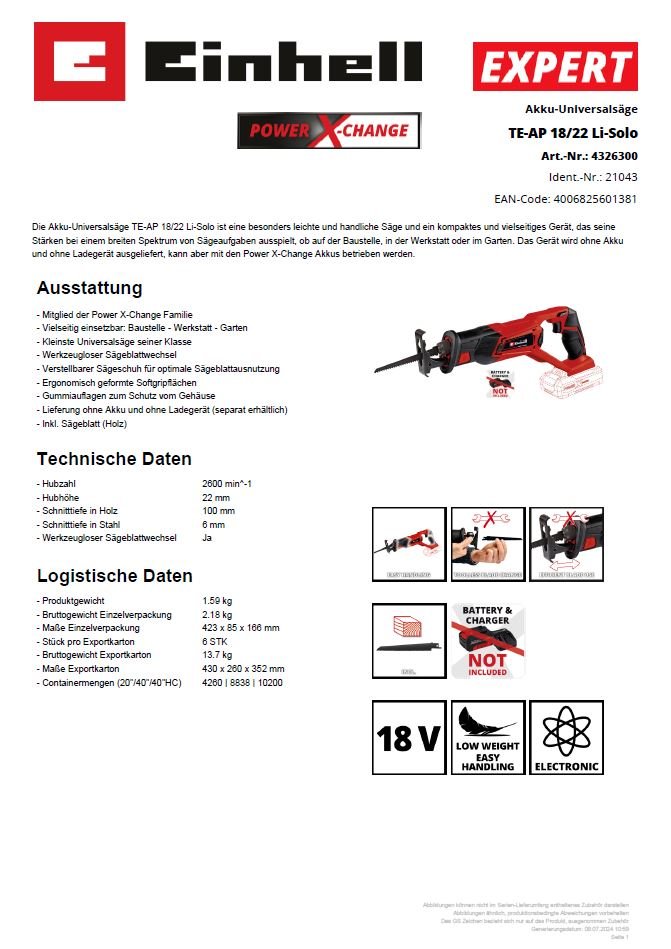 Akkusäge - Universalsäge - Unser Allrounder bei Sägearbeiten - Art.Nr.: 4326300 Artikel-Nr.: 85100018 Hersteller: Einhell Germany AG
