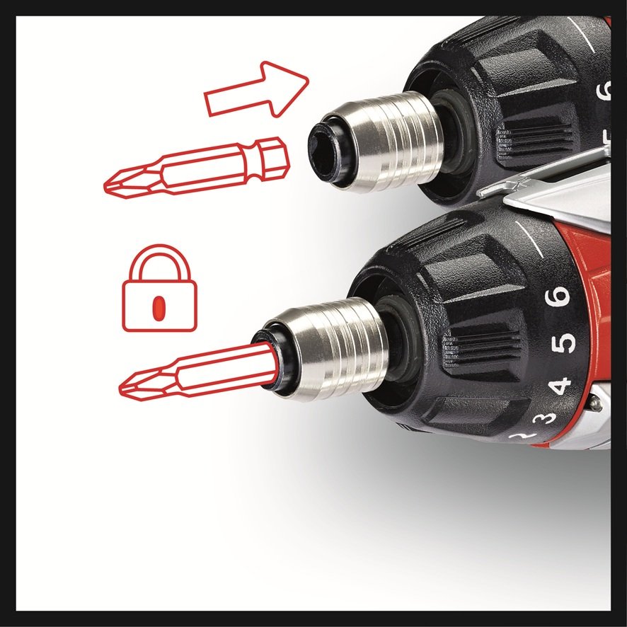 Das in sieben Stufen einstellbare Drehmoment des TE-SD 3,6 Li Kit sorgt bei jeder Schraubaufgabe für präzise Dosierung der über ein robustes Metall-Getriebe mit Rechts- und Linkslauf übertragenen Kräfte. Für sichere Fixierung und schnellen Austausch der Bits, verfügt das Gerät über eine Bit-Verriegelung. Ein Magnet-Schraubenhalter erspart die dritte Hand.