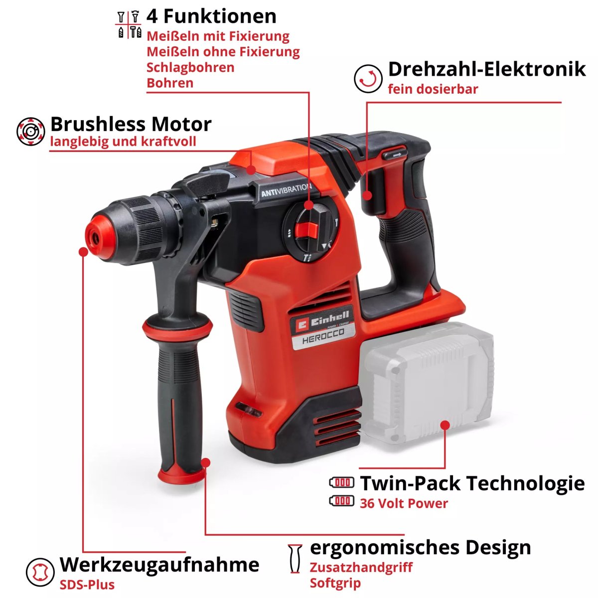 Der Einhell Professional Akku-Bohrhammer Herocco 36/28 ist ein starker Helfer für die Baustelle, der 3,2 Joule Kraft und eine hohe Bohrleistung mit der kabellosen Freiheit eines Akku-Gerätes vereint.