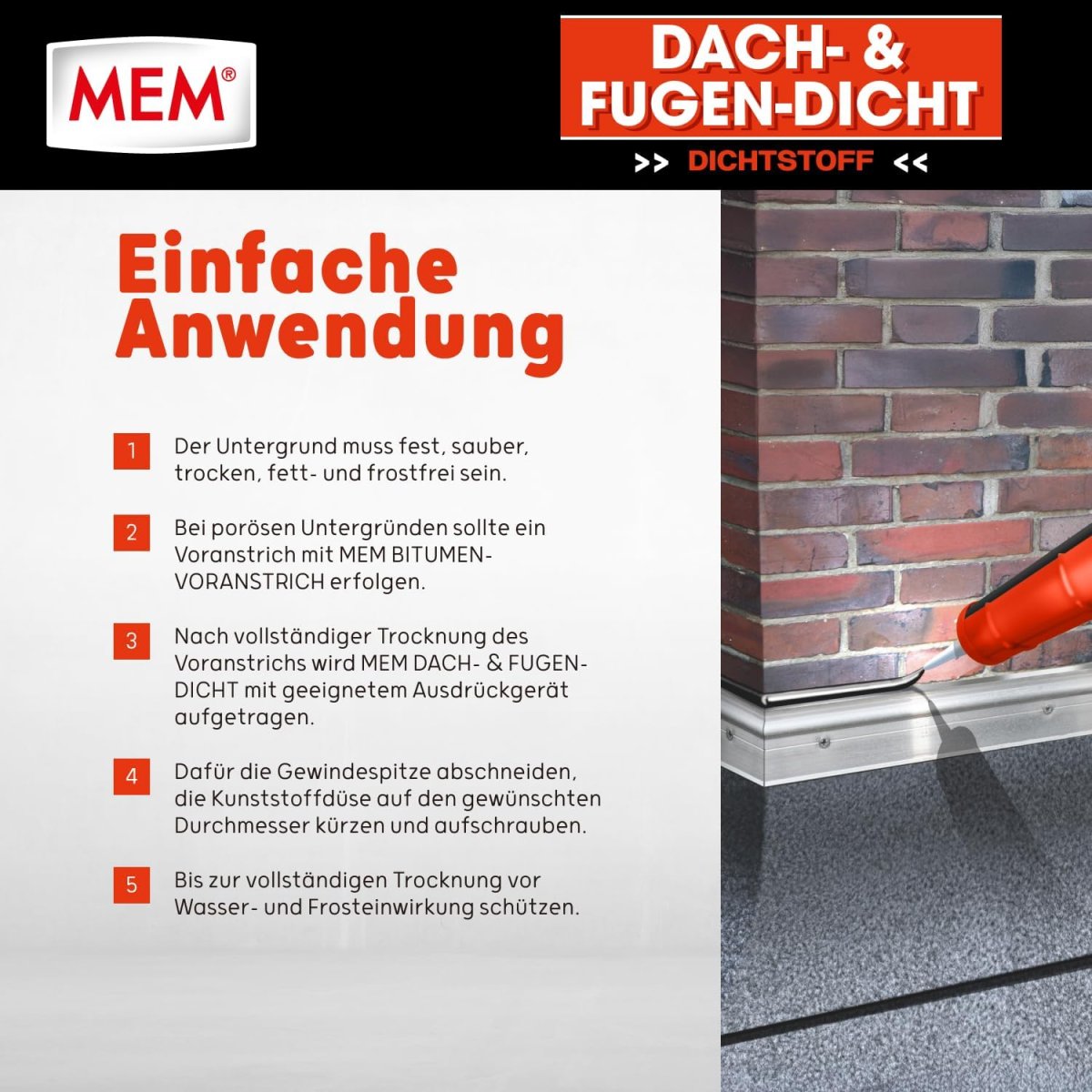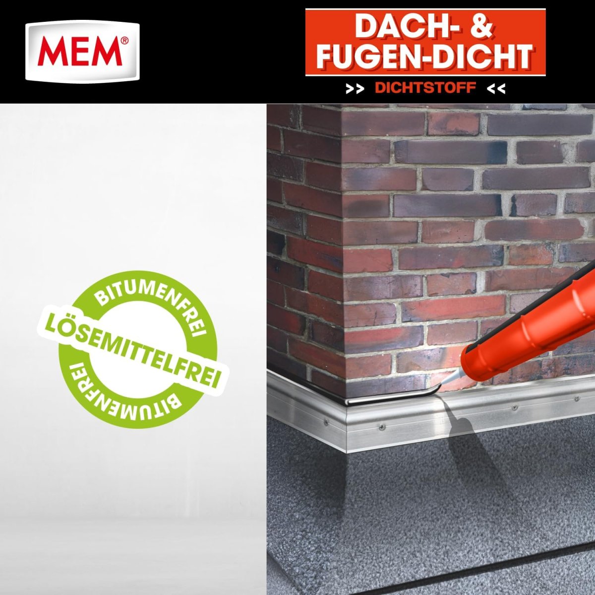 MEM DACH- & FUGEN-DICHT ist eine Fugenmasse auf Bitumenbasis zur Ausbesserung von Rissen, Fugen, Kehlen etc. und zur Abdichtung von z. B. Kamin- und Maueranschlüssen, Dachantennen oder Durchbrüchen im Dachbereich.