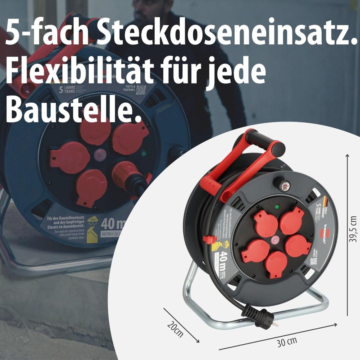 • Die Kabeltrommel mit 40m Kabellänge ist mit einem (H07RN-F 3G1,5) RN-Kabel, zugelassen für erschwerte Baubedingungen nach VDE 0100 Teil 704, ausgestattet - das RN-Kabel ist sehr robust, ölbeständig und für den professionellen Einsatz besonders geeignet