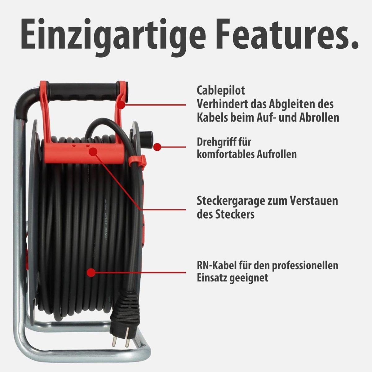 • Die Kabelrolle ist mit dem innovativen Tragegriff "cablepilot" ausgestattet, welcher freie Hände beim Transport, praktisches Aufhängen und schnelles Ab- und Aufrollen ermöglicht