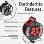 • Die Outdoor-Kabeltrommel verfügt über 5 spritzwassergeschützte Schutzkontakt-Steckdosen mit selbstschließenden Deckeln, einen Überhitzungsschutz, Kontroll-Leuchte bei Überhitzung und Überlastung und eine optische Bereitschaftsanzeige im Steckdoseneinsatz