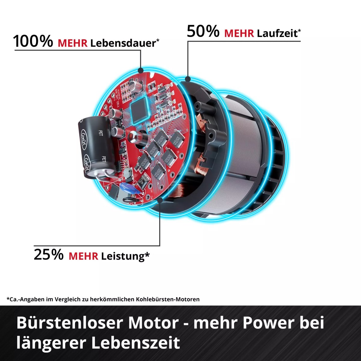 Als Mitglied der beliebten Power X-Change-Familie sind alle Akkus der Systemfamilie untereinander austauschbar. Angetrieben wird das Gerät von einem Einhell Brushless Motor. Dieser bürstenlose Motor bietet mehr Kraft und eine längere Laufzeit als herkömmliche Kohlebürsten-Motoren. Nach einer Online-Registrierung gelten 10 Jahre Garantie auf den Brushless-Motor. Die stufenlose Drehzahl-Regelelektronik mit leistungsstarkem Motor lässt sich an die jeweiligen Anforderungen und Materialien individuell anpassen.