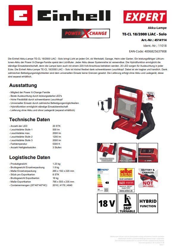 Die Einhell Akku-Lampe TE-CL 18/2000 LiAC - Solo bringt Licht ins Dunkel, ob auf der Baustelle, bei Einsätzen in der Werkstatt, Garage oder im Garten.
